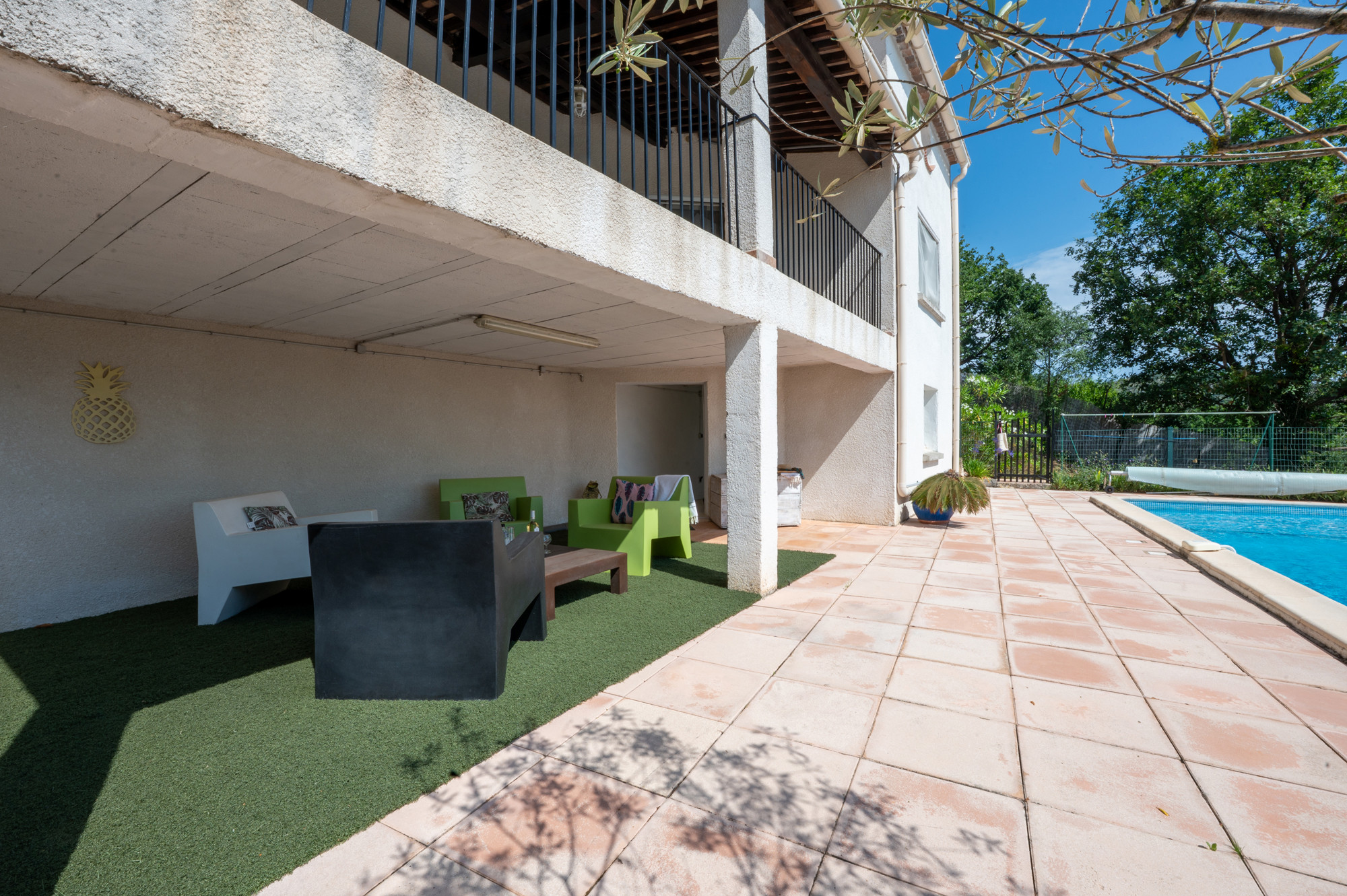Eingezäuntes privates Schwimmbad (9 x 4 m, Tiefe 0,50–1,90 m, Heizung auf Anfrage) | Große Sonnenterrasse mit Liegestühlen | Geräumige überdachte Terrasse mit Lounge-Sitzgruppe | Grill | Zusätzliches Badezimmer mit Dusche & separater Toilette am Schwimmbad | Grünes, teilweise hügeliges Privatgrundstück von ca. 1.200 m² | Parkplatz auf eigenem Gelände