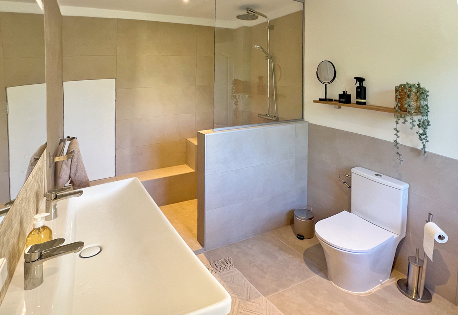 -Eigenes Badezimmer mit begehbarer Dusche, Doppelwaschbecken und Toilette