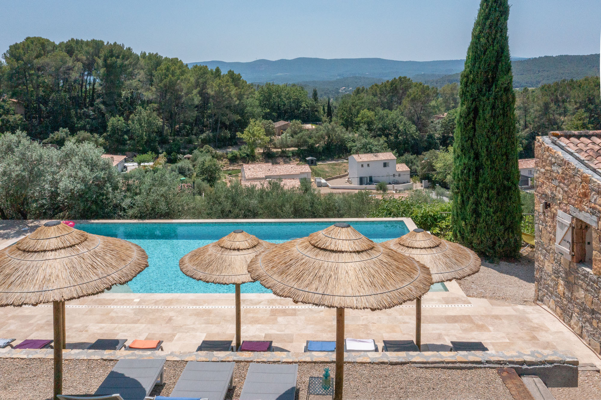 Beide Bastides befinden sich auf geräumigen, angrenzenden, privaten Grundstücken, umgeben von mediterraner Bepflanzung und mit Blick auf die Provenzalische Landschaft und das Maures-Gebirge.