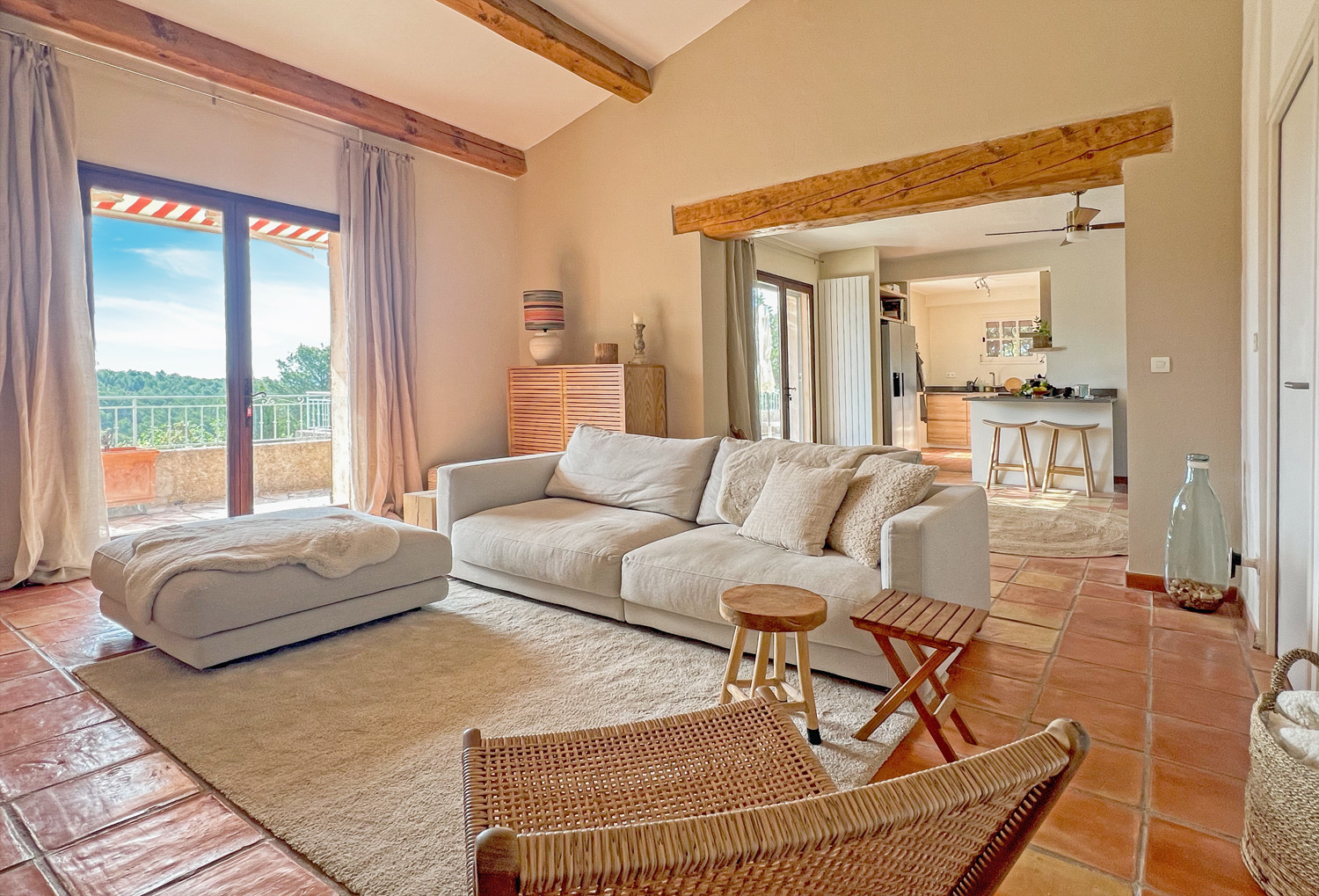 Upon entering, the villa immediately exudes the atmosphere of Southern France. Authentic wooden beams, a terracotta-coloured floor and furniture in natural tones create a warm and harmonious whole.