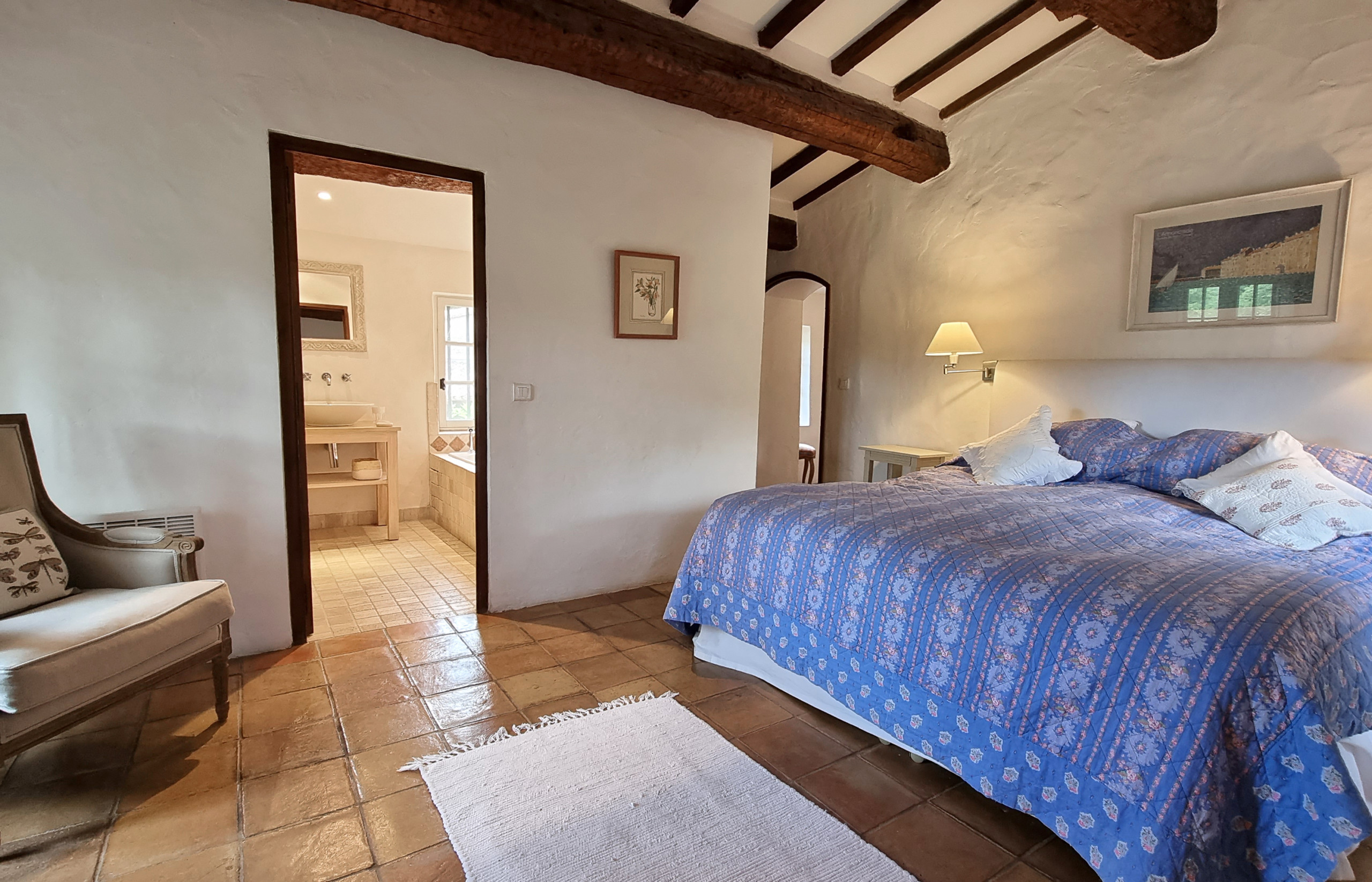• Chambre 1 : Lit king size (200 x 180 cm), dressing, portes-fenêtres, salle de bain attenante : douche, baignoire, double vasque, toilettes