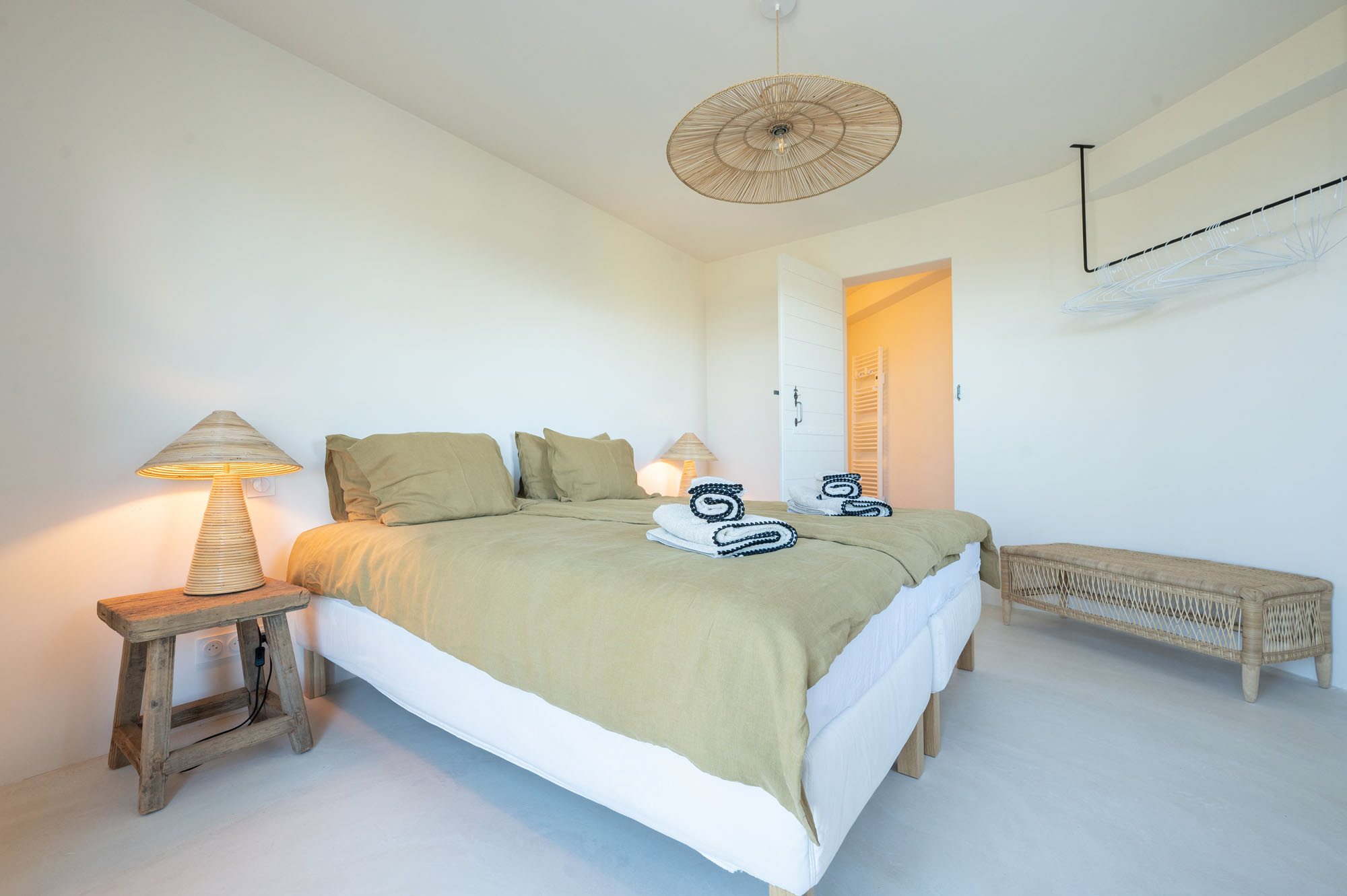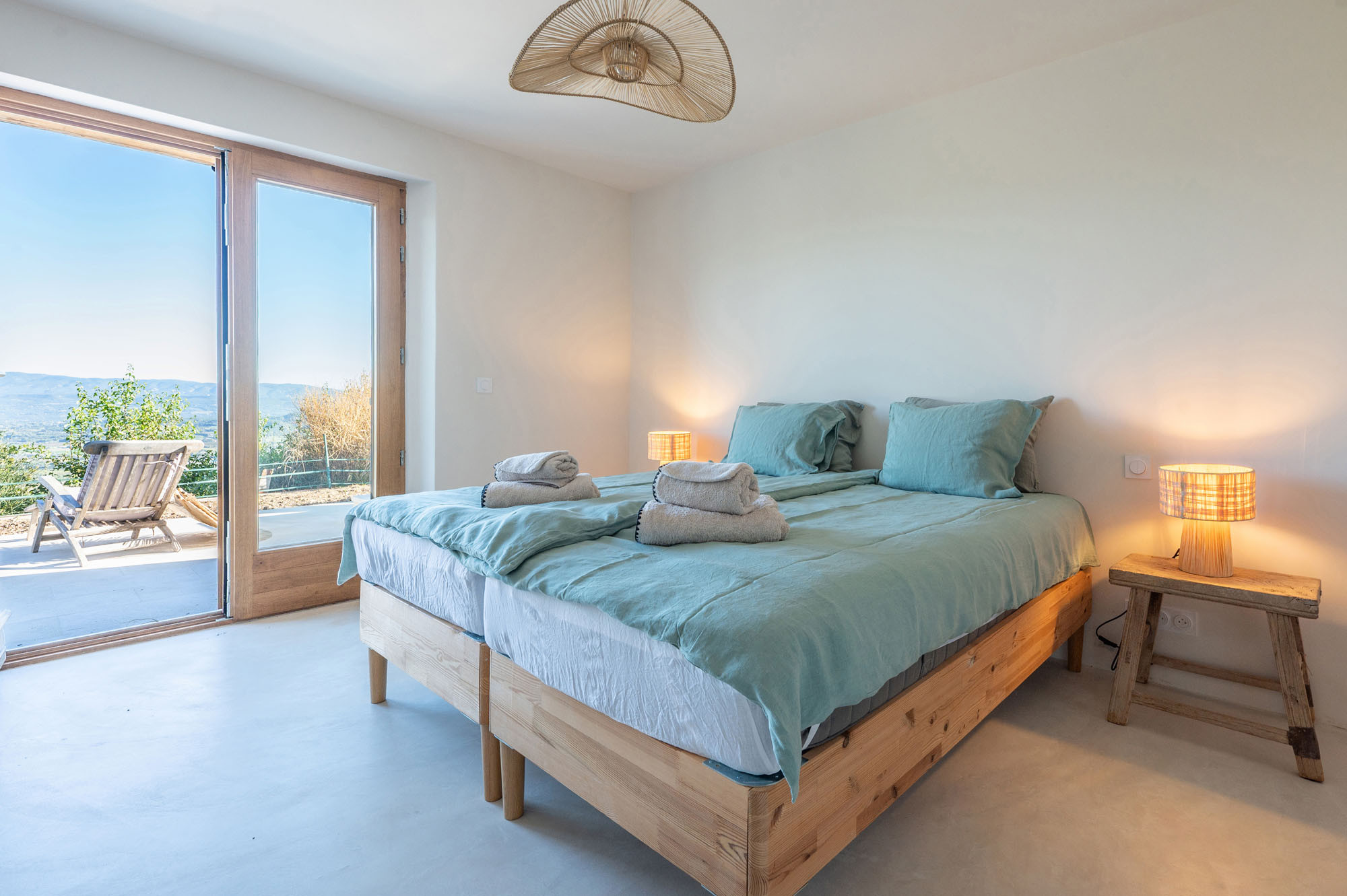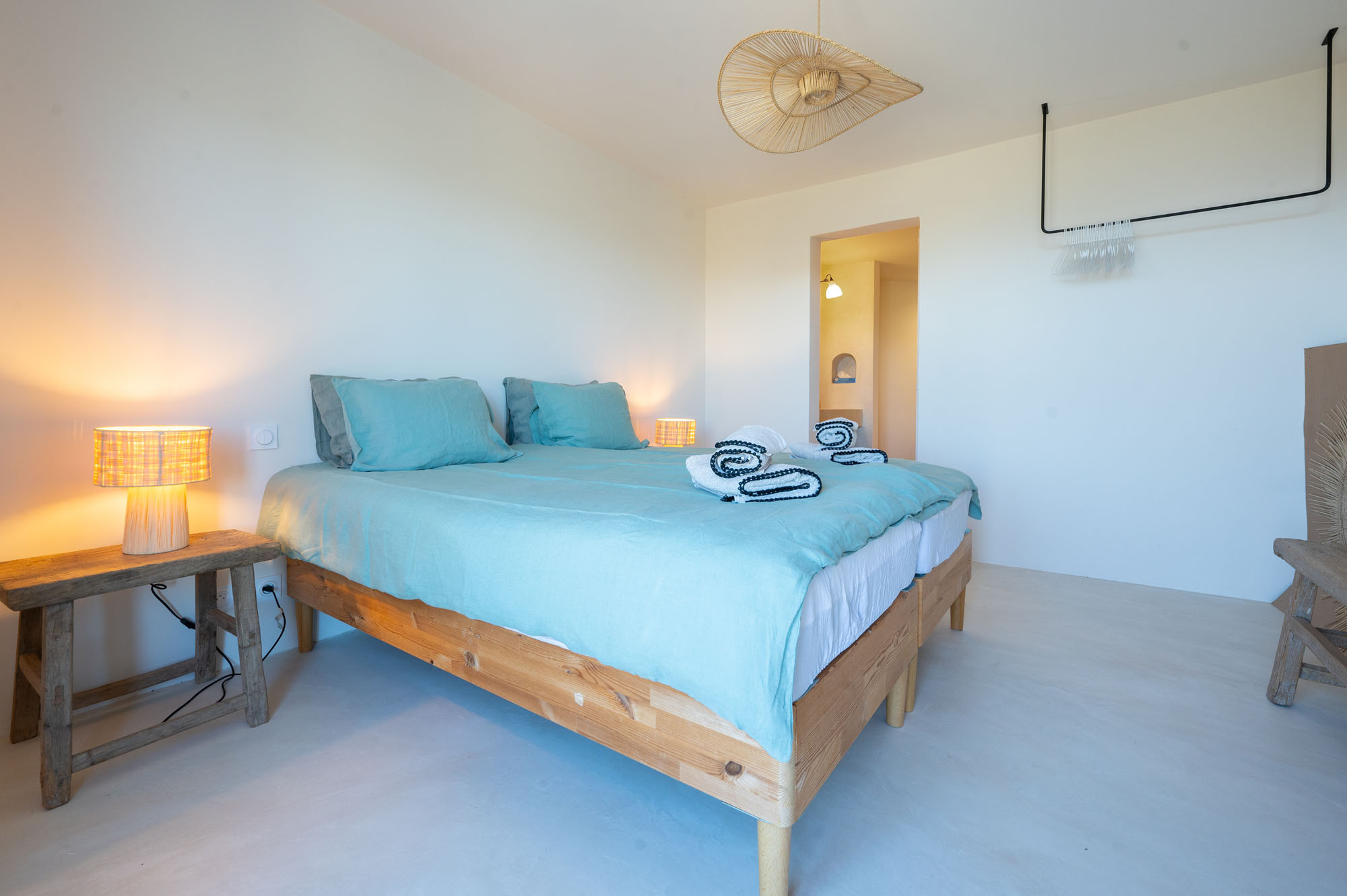 . Chambre 1 : Lit queen size (160x200 cm), portes-fenêtres, climatisation