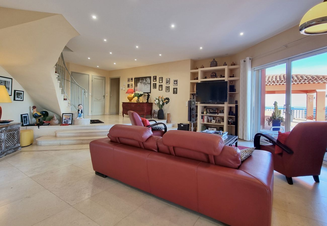 La villa offre un espace de vie lumineux avec de grandes baies vitrées encadrant parfaitement les vues spectaculaires.