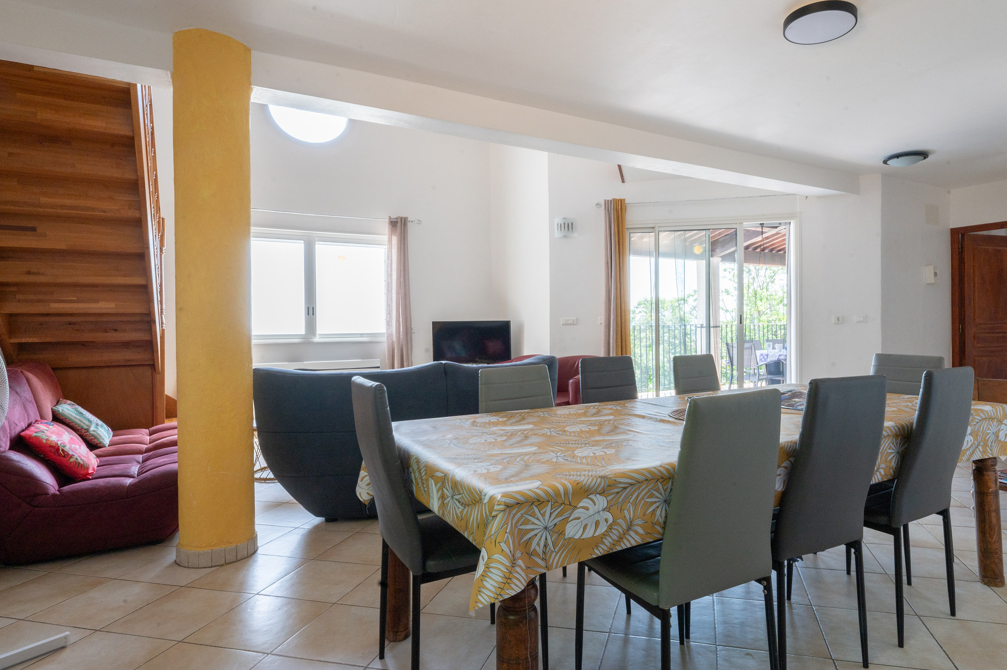 De leefverdieping bevindt zich op het aankomstniveau. De lichte woonkamer en eethoek staan volledig in het teken van het panoramische uitzicht, met directe toegang tot het balkon en terras. Een prettige, verzorgde inrichting zorgt voor een ontspannen sfeer, binnen én buiten.