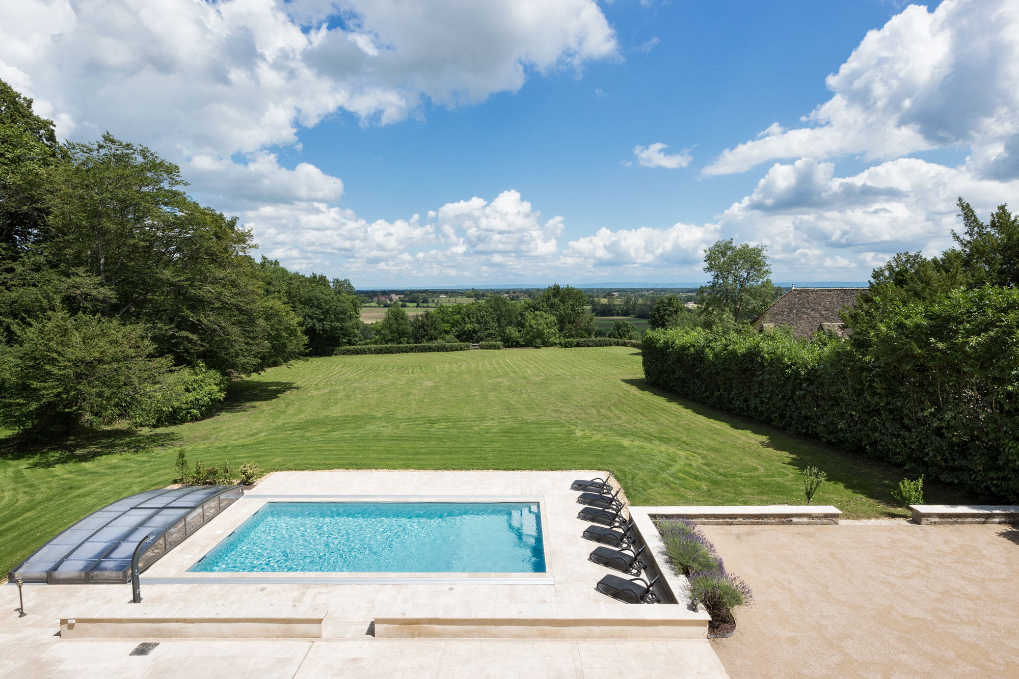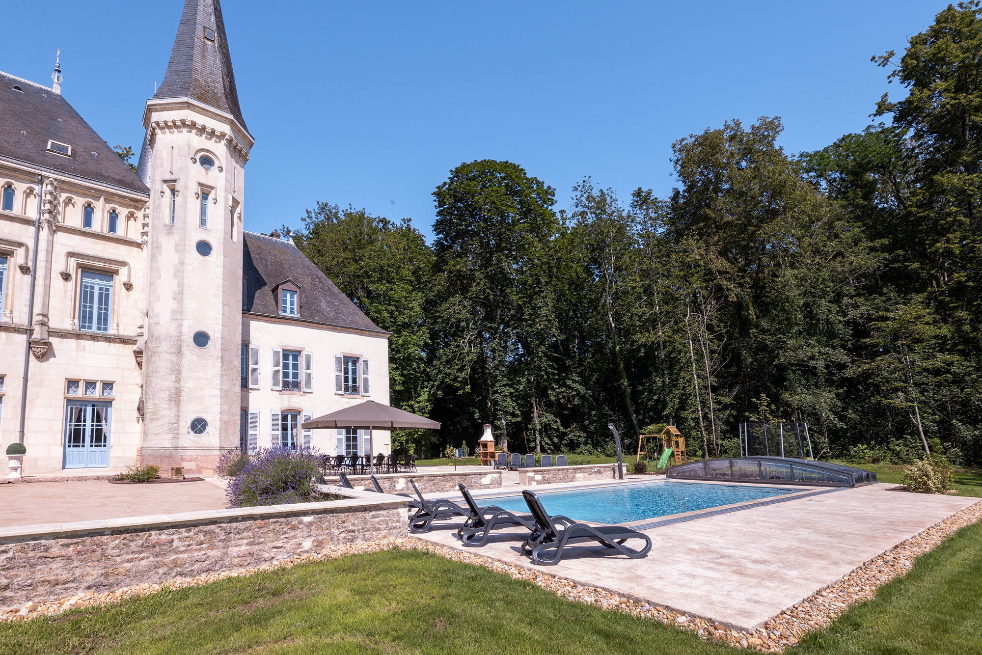 Het zwembad vormt het hart van het verblijf — ontspannen, dineren en lange zomeravonden onder de Bourgondische hemel.