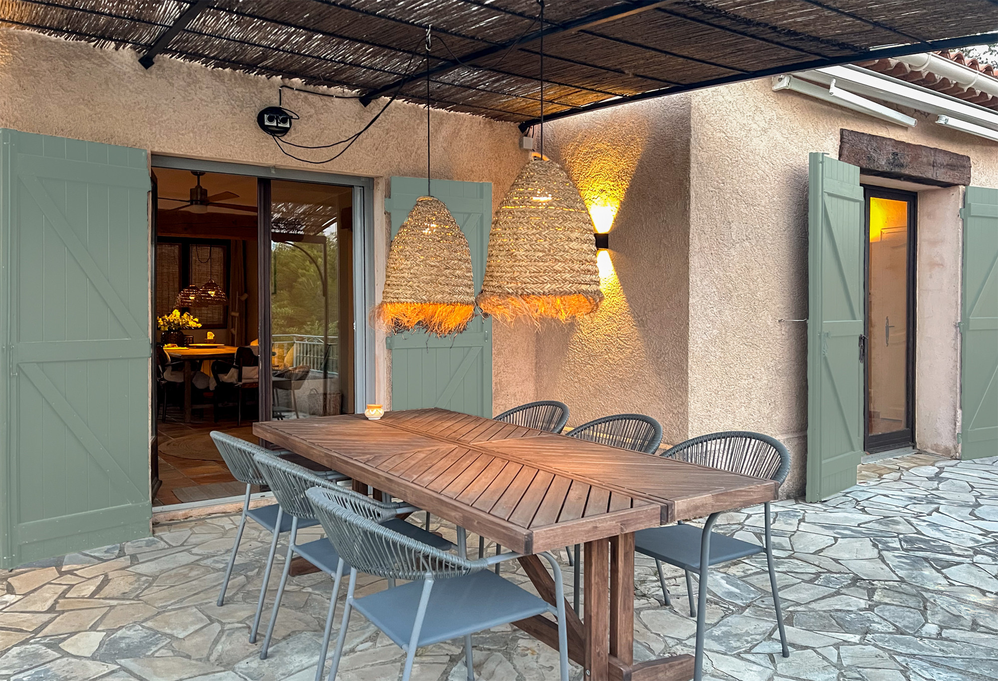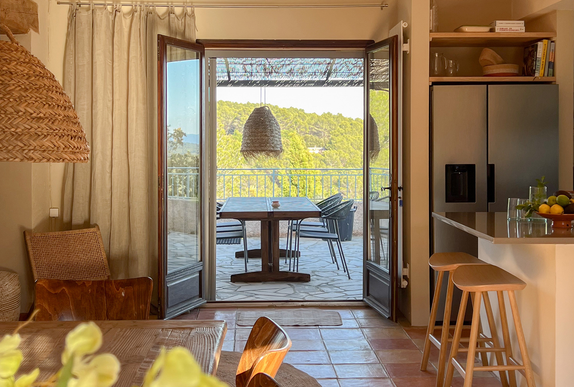 Bij binnenkomst ademt de villa meteen de sfeer van Zuid-Frankrijk uit. Authentieke houten balken, een terracotta-gekleurde vloer en meubels in natuurlijke tinten creëren een warm en harmonieus geheel.