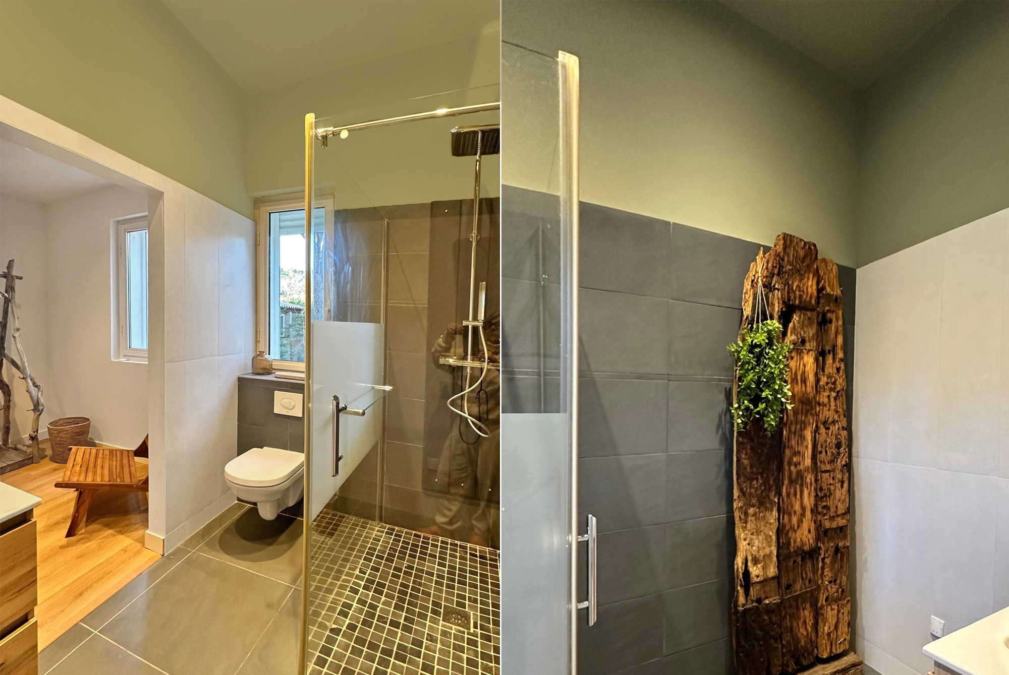 Badkamer met douche, wastafel en toilet